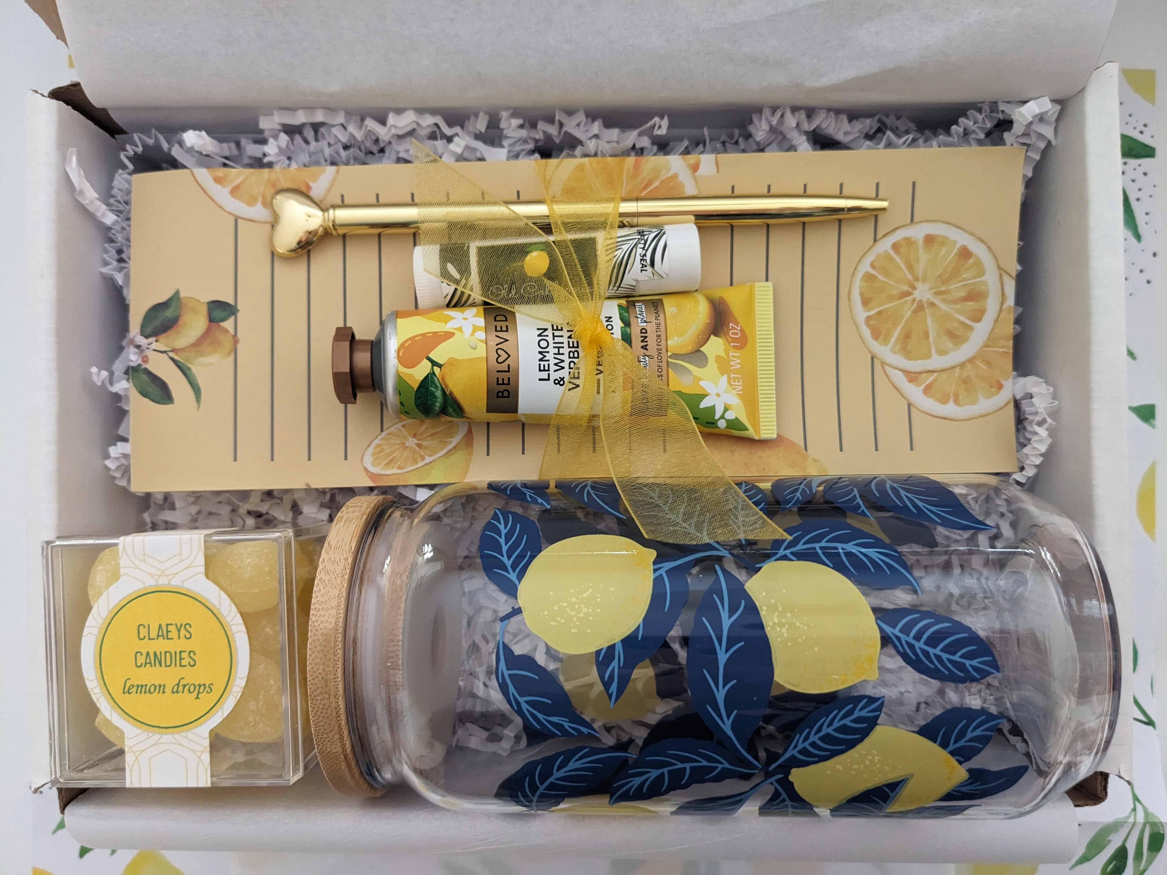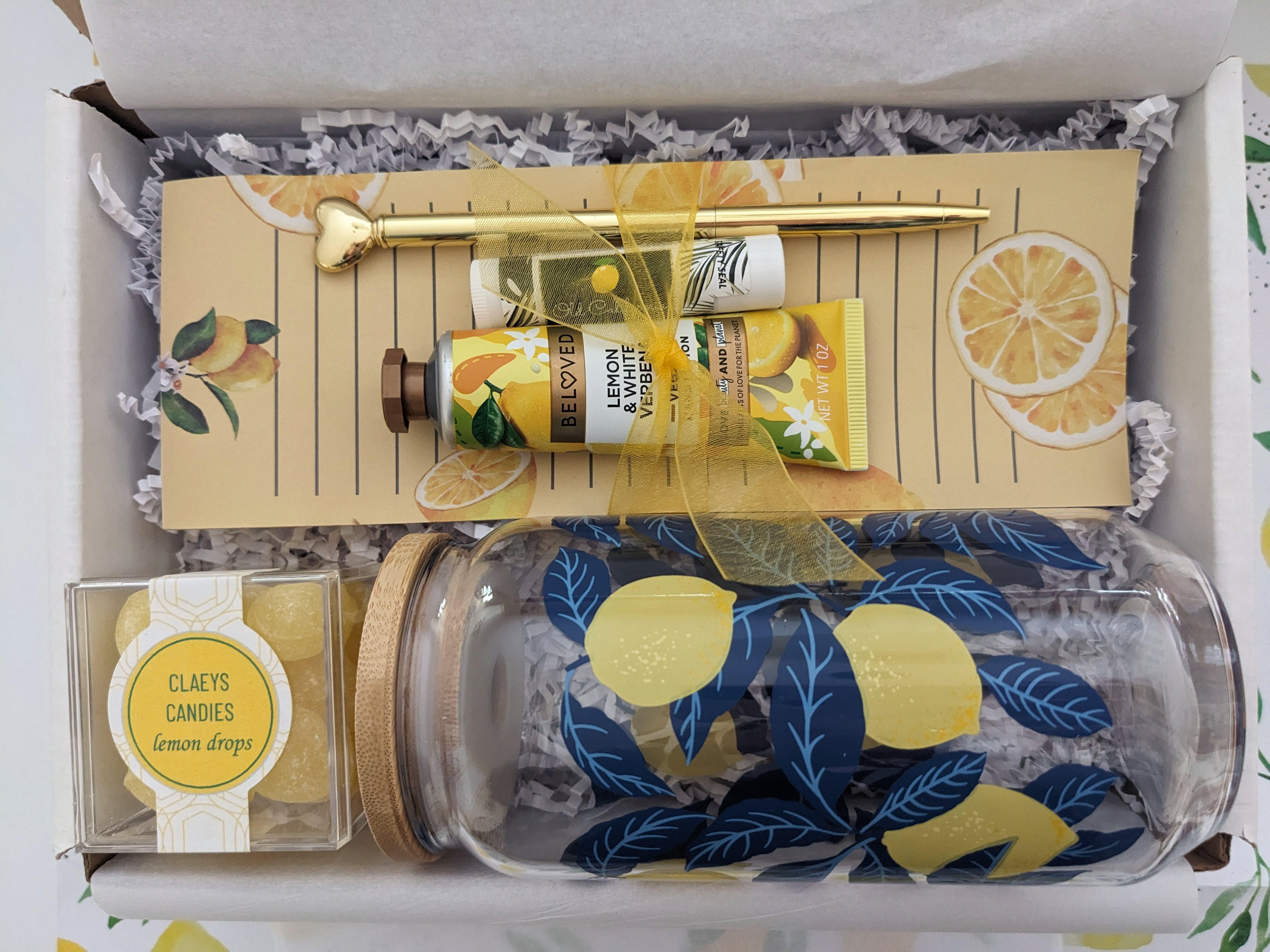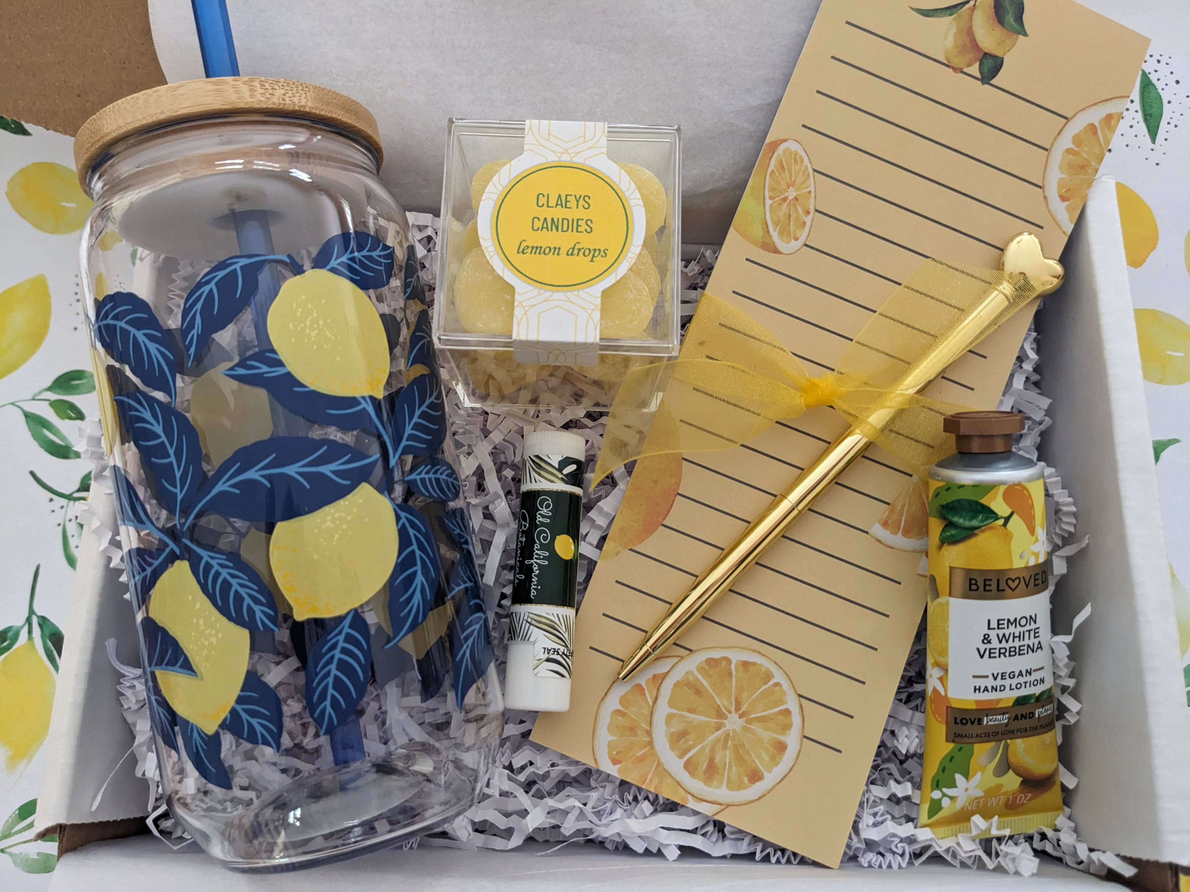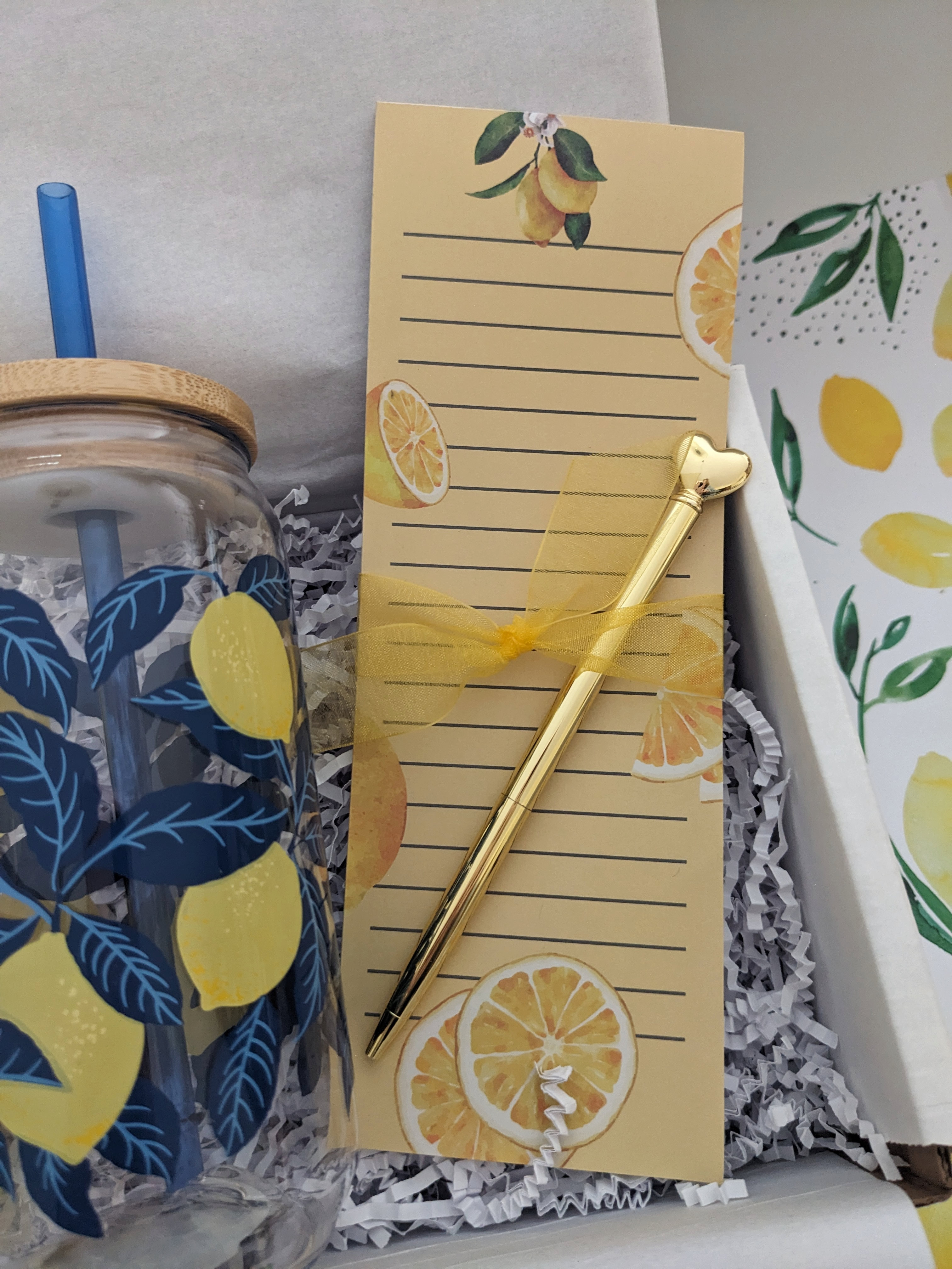 Brighten someone’s day with this cheerful SUMMER LEMON Gift Box, bursting with zesty charm and sunshine-inspired goodies, perfect for birthdays, thank-you gifts, or a refreshing seasonal surprise. This vibrant set includes a Lemon Acrylic Tumbler with a secure lid and reusable straw, ideal for enjoying iced drinks on warm days. Stay organized with the charming Lemon Magnetic Grocery List Notepad and jot down thoughts or to-do’s using the elegant Gold Heart-Shaped Pen. Satisfy a sweet tooth with Claey’s Old Fashioned Hard Candy Lemons, offering a nostalgic citrus twist. Pamper hands with the crisp, clean scent of Beloved Lemon & White Verbena Hand Lotion, and keep lips soft and smooth with the naturally soothing Old California Botanicals Citrus Lip Balm. Each item is thoughtfully chosen to celebrate the fresh, joyful spirit of summer. A perfect gift to sweeten any summer moment!