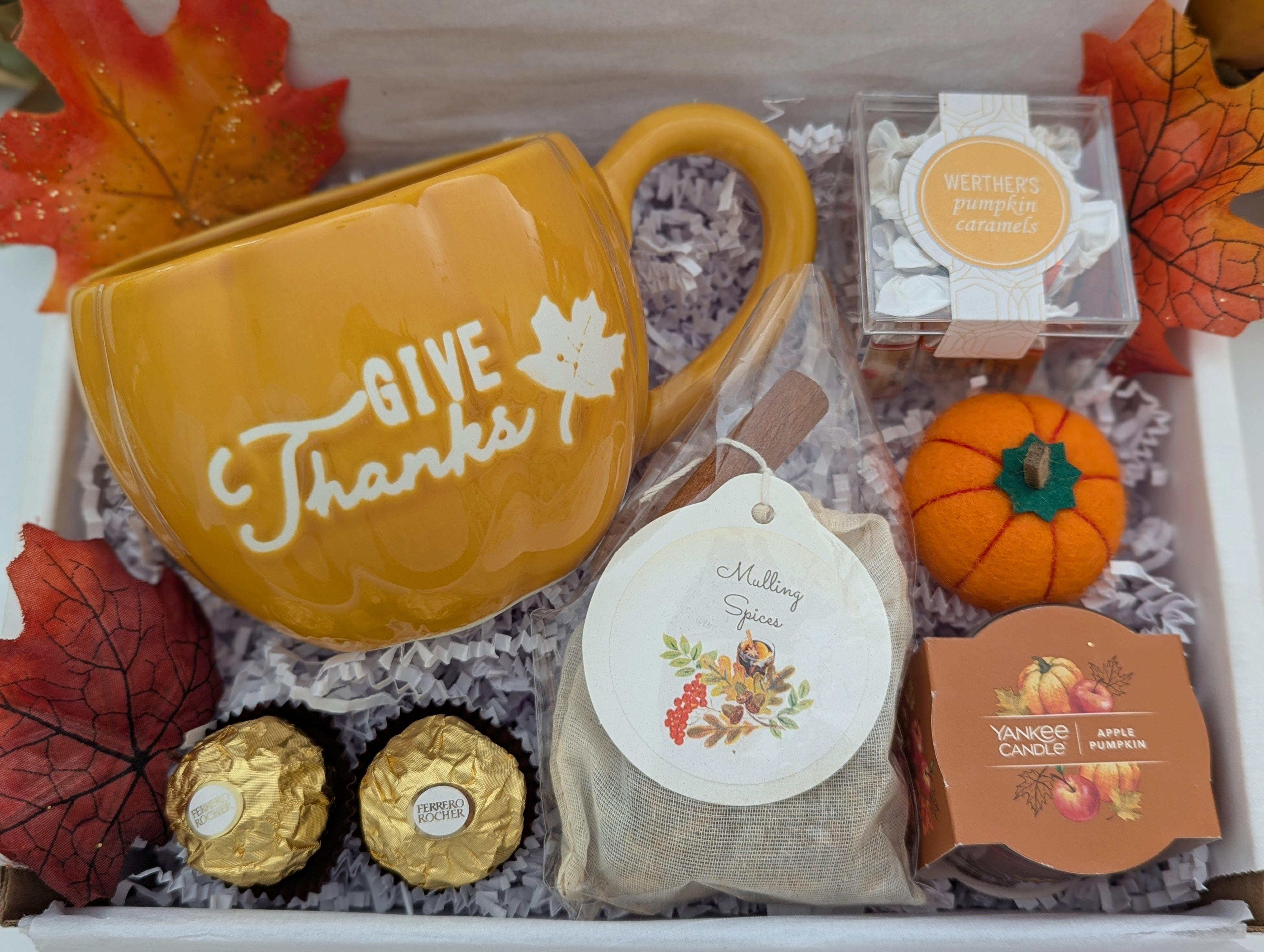 Celebrate the warmth of the season with this thoughtfully curated gift box, perfect for sharing gratitude and autumn cheer. Inside, you’ll find a charming “Give Thanks” ceramic mug to enjoy cozy beverages, accompanied by fragrant mulling spices for the perfect seasonal drink. Savor sweet treats like Werther’s Pumpkin Caramels and Ferrero Rocher Fine Hazelnut Chocolates, and set the mood with a Yankee Candle in Apple Pumpkin scent. A pumpkin felt décor adds a festive finishing touch, making this box a beautiful way to say “thank you”, to brighten someone’s day or to keep for yourself